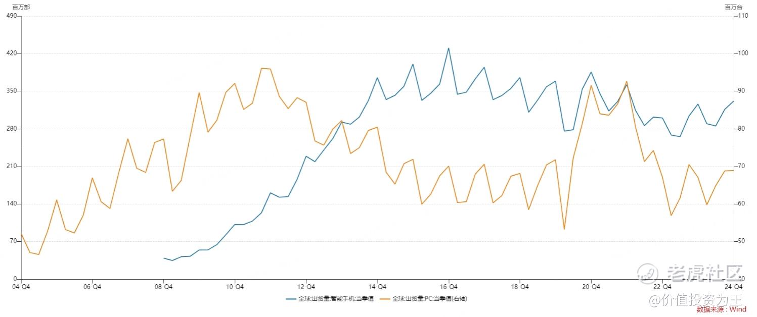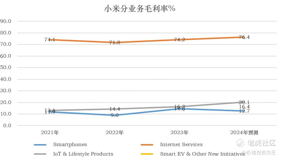 小米最近真是涨疯了,欧博allbet股价已经逼近50元大关,较2022年低点涨了479%: $小米集团-W(01810)$ 暴涨之后,小米的市销率估值已经逼近2021年时的最高点: 巨大的涨幅和历史极高估值,小米涨势到头了吗? 从业务上看,小米主要有三块业务,一是手机;二是IOT;三是小米汽车。互联网服务和其他业务收入规模较小,而且,前者依附于小米手机,可以合二为一。 根据分析师的预测,2024年,小米手机的营收约在1898亿人民币,同比增长20.5%;IoT营收约996亿,同比增长24%;小米汽车营收约317亿;互联网服务337亿,同比增长12%;其他收入33亿,同比增长1%: 从成长性上看,小米手机已经停滞了3年,从全球智能手机出货量来看,欧博百家乐手机行业已经触及天花板,未来很难有所突破,PC亦如此: IoT业务因为小米不断的扩充品类,依然还在增长中;小米汽车去年大获成功,是未来主要增长点;互联网服务随着小米用户的增加保持平稳增长,比较稳定;其他收入没有成长性。 从毛利率上看,小米手机只有12.7%;IoT20%;小米汽车16.4%;互联网服务76%: 小米的手机业务、IoT和小米汽车的盈利能力都比较低,很难拿到高估值,参考苹果、美的及其他车企,我们可以分业务给出估值。 其中,把手机业务和互联网服务收入算到一块,2024年,两者的收入总额在2234亿,毛利496亿,毛利率22.2%。 苹果的毛利率是46.2%,市销率9.4倍,市盈率35倍。 考虑到港股市场的流动性较差、小米盈利能力偏低,结合其他行业,小米手机+互联网服务能拿到的市销率倍数也就在2倍,给予4468亿市值。 IOT业务直接参考美的集团,2023年,美的毛利率26.5%,比小米的20%高出不少。 目前,美的集团的市销率是1.37倍,考虑到小米的IoT成长性高于美的,假设拿同样的估值,给予996亿市值。 小米汽车直接对标蔚小理,2025年营收预计在785亿,给3倍市销率,约2355亿市值。 其他业务就按照1倍市销率给,33亿市值。 分业务给予估值后,小米的合理估值在4468+996+2355+33=7852亿人民币,小米目前的估值是1.1万亿,高出40%! 这波大涨,投资者主要是对小米的汽车业务抱有较高期待,叠加AI预期升温,因此,小米的涨幅,主要来自乐观情绪。 但是,别忘记,无论是小米的手机还是IoT,亦或是汽车,都是周期性行业,而且盈利能力偏低,很难拿高估值,目前的位置,说实话,不太适合无脑追了!